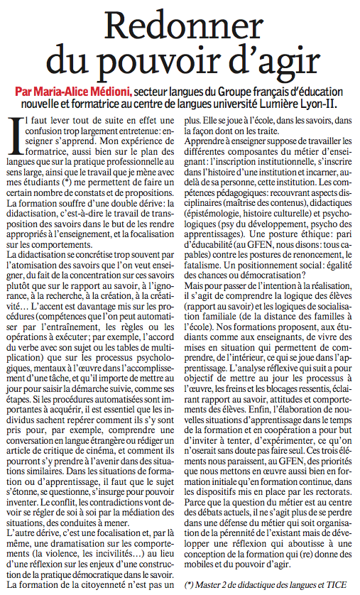 Il faut lever tout de suite une confusion trop largement entretenue : enseigner s'apprend. Mon expérience de formatrice, aussi bien sur le plan des langues que sur la pratique professionnelle au sens large, ainsi que le travail que je mène avec mes étudiants me permettent de faire un certain nombre de constats et de propositions. La formation souffre d'une double dérive : la didactisation, c'est-à-dire le travail de transposition des savoirs dans le but de les rendre appropriés à l'enseignement, et la focalisation sur les comportements.